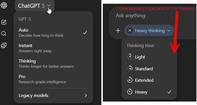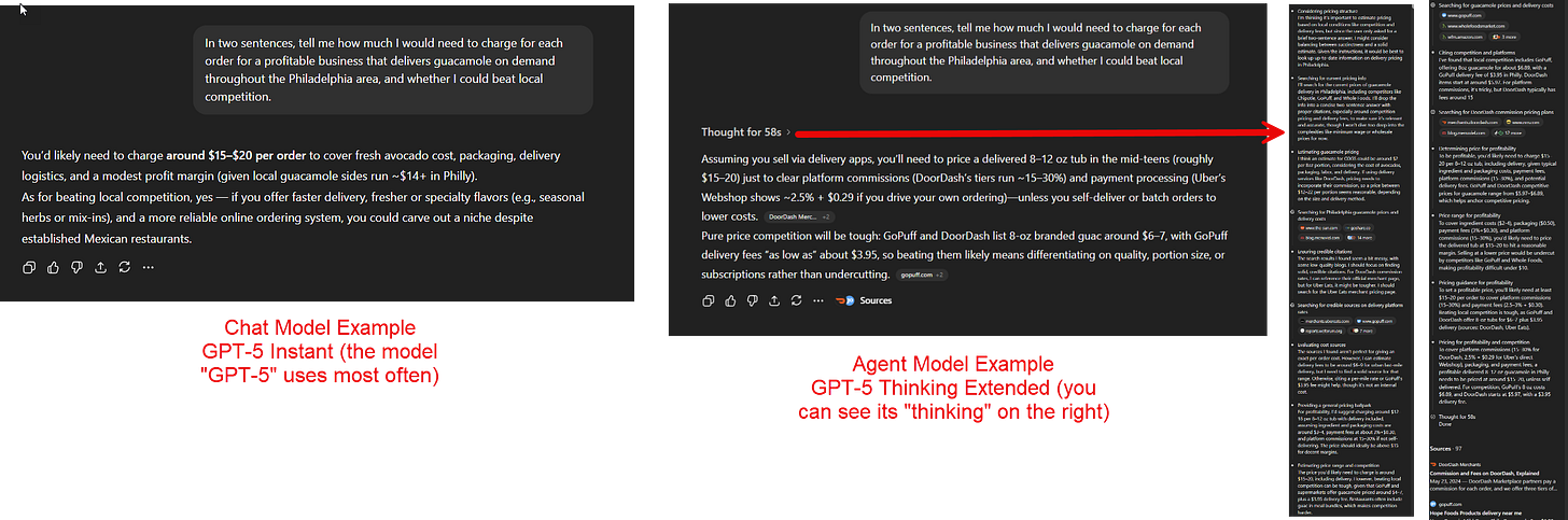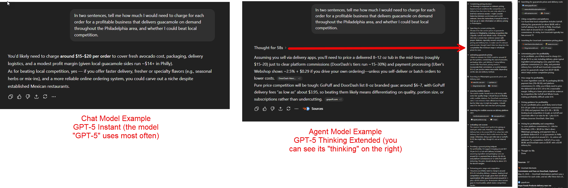 For ChatGPT, no matter whether you use the free or pay version, the default model you are given is “ChatGPT 5”. The issue is that GPT-5 is not one model, it is many, from the very weak GPT-5 mini to the very good GPT-5 Thinking to the extremely powerful GPT-5 Pro. When you select GPT-5, what you are really getting is “auto” mode, where the AI decides which model to use, often a less powerful one. By paying, you get to decide which model to use, and, to further complicate things, you can also select how hard the model “thinks” about the answer. For anything complex, I always manually select GPT-5 Thinking Extended (on the $20 plan) or GPT-5 Thinking Heavy (if you are paying for the $200 model). For a really hard problem that requires a lot of thinking, you can pick GPT-5 Pro, the strongest model, which is only available at the highest cost tier.