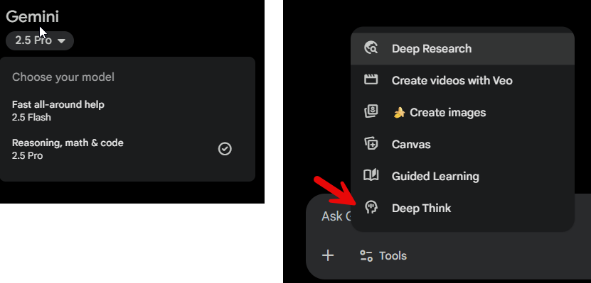 For Gemini, you only have two options: Gemini 2.5 Flash and Gemini 2.5 Pro, but, if you pay for the Ultra plan, you get access to Gemini Deep Think (which is in another menu). At this point, Gemini 2.5 is the weakest of the major AI models (though still quite capable and Deep Think is very powerful), but a new Gemini 3 is expected at some point in the coming months.