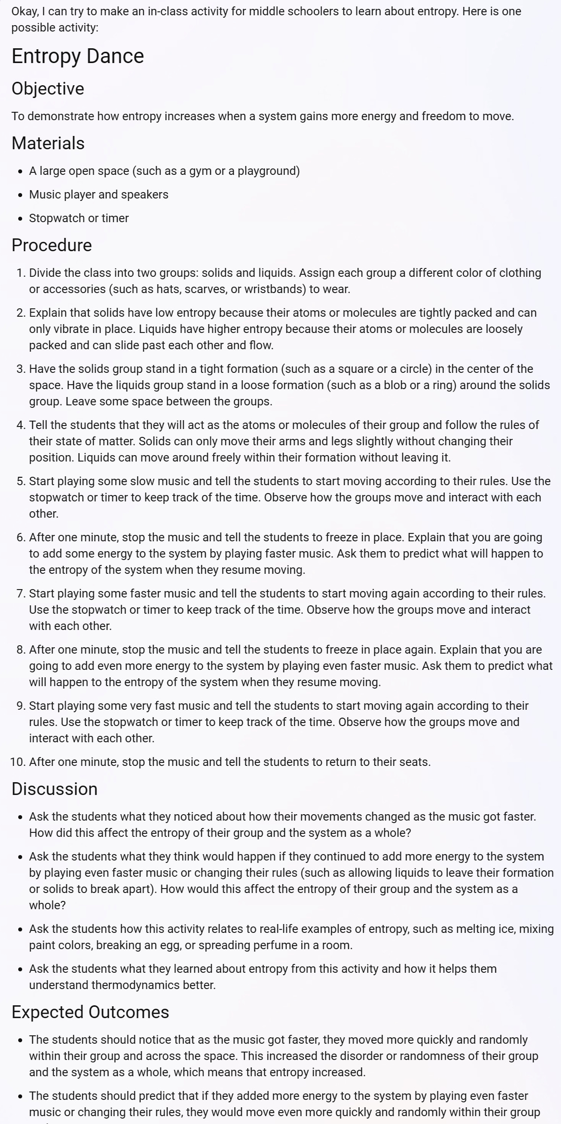 This still seems a little boring. Make a in-class activity for middle schoolers to learn about entropy. Make sure it involves them moving around. Give me the exact instructions to give the class and the way to run the exercise. Impressvely, it produces a pretty interesting class exercise (this is the first time I ever tried this prompt, by the way, it just did this without any edits or feedback)