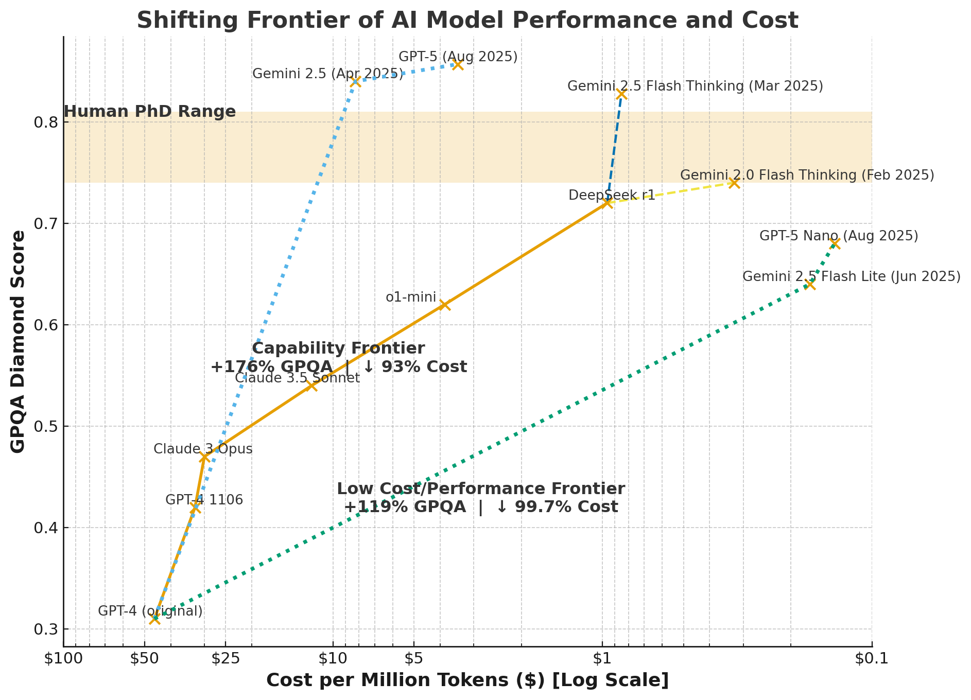 Part of this change is driven by the fact that smarter models are getting dramatically more efficient to run. This graph shows how fast this trend has played out, mapping the capability of AI on the y-axis and the logarithmically decreasing costs on the x-axis. When GPT-4 came out it was around $50 to work with a million tokens (a token is roughly a word), now it costs around 14 cents per million tokens to use GPT-5 nano, a much more capable model than the original GPT-4.