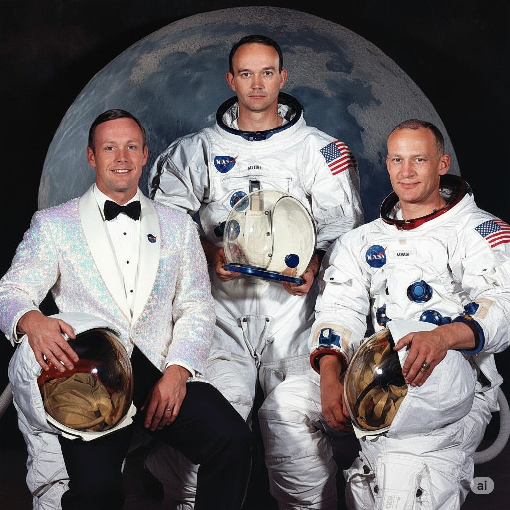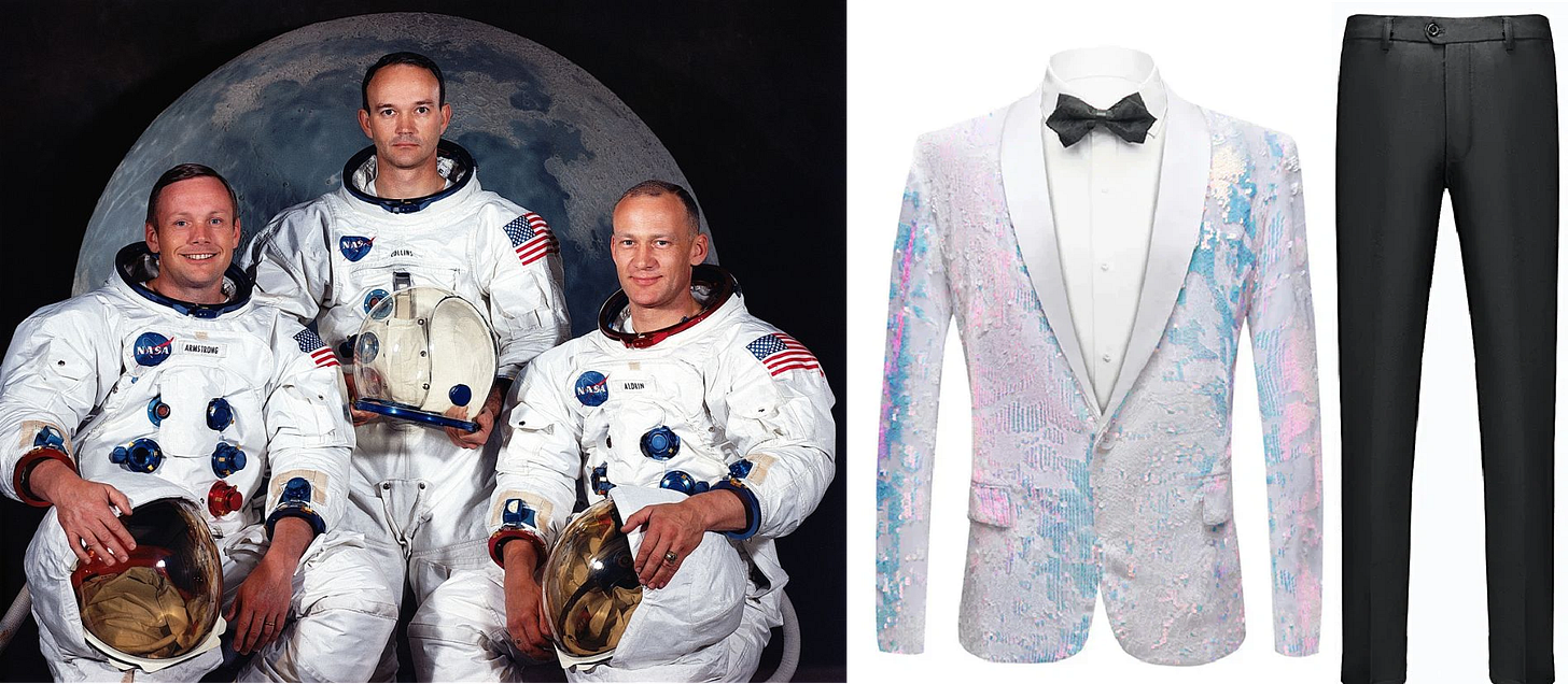 As an example of both its power and ease of use, I uploaded an iconic (and copyright free) image of the Apollo 11 astronauts and a random picture of a sparkly tuxedo and gave it the simplest prompts: “dress Neil Armstrong on the left in this tuxedo”