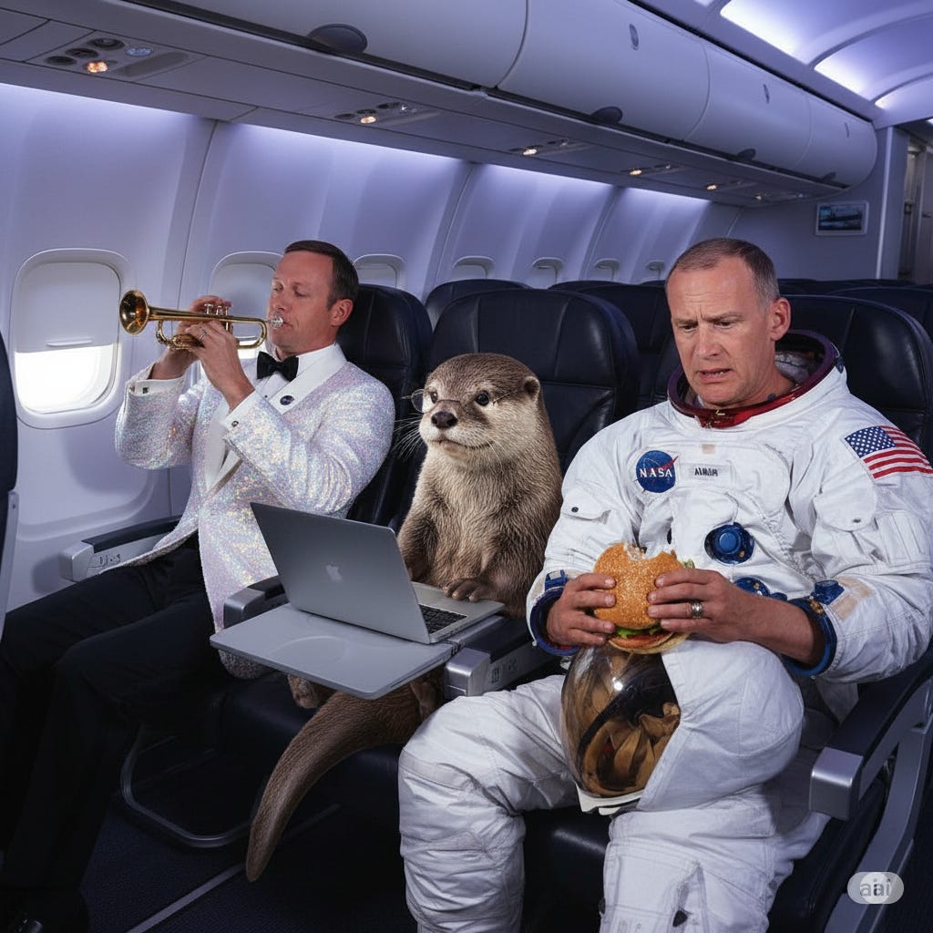 And we can go further: “now show a photograph where neil armstrong and buzz aldrin, in the same outfits, are sitting in their seats in a modern airplane, neil looks relaxed and is leaning back, playing a trumpet, buzz seems nervous and is holding a hamburger, in the middle seat is a realistic otter sitting in a seat and using a laptop.”