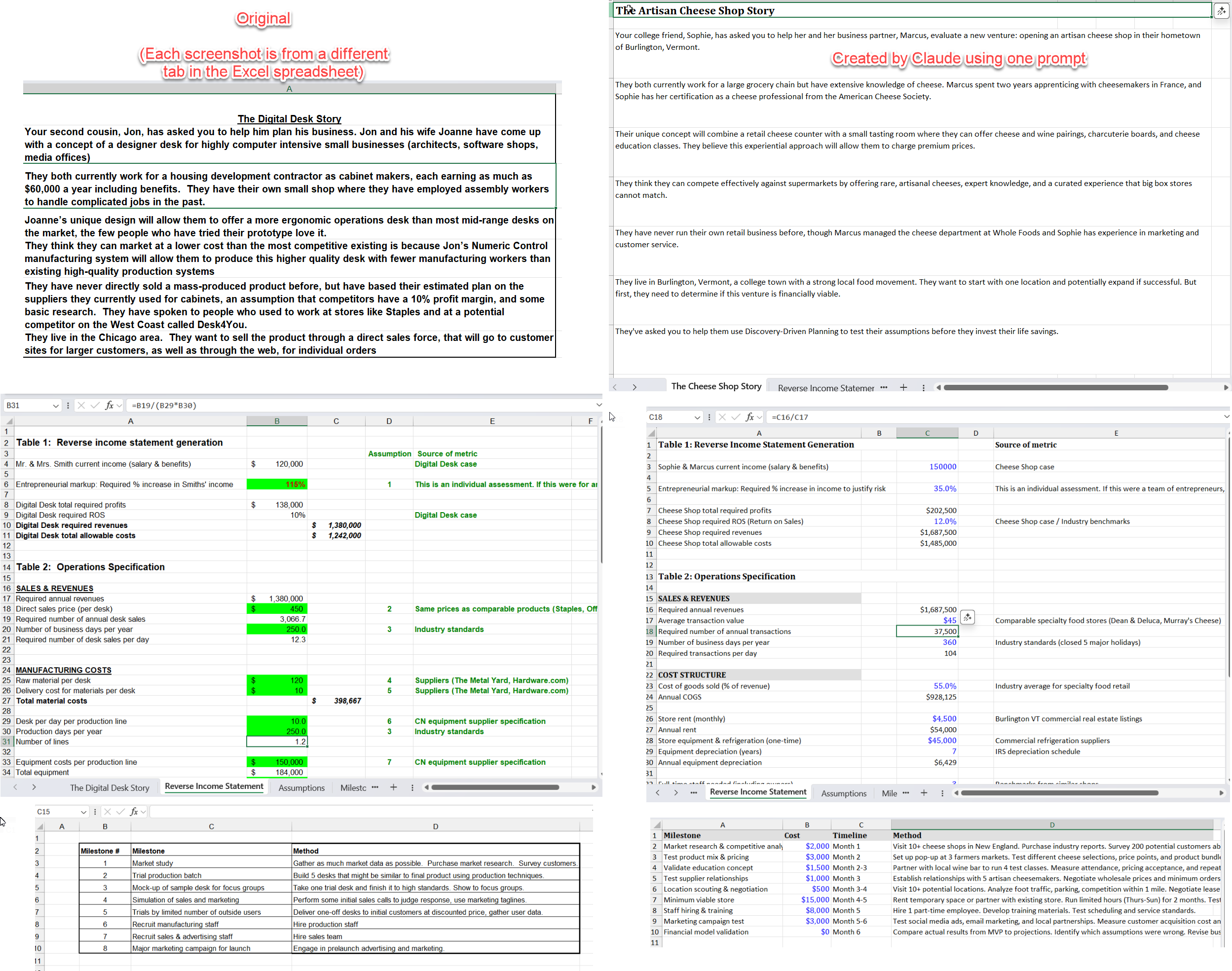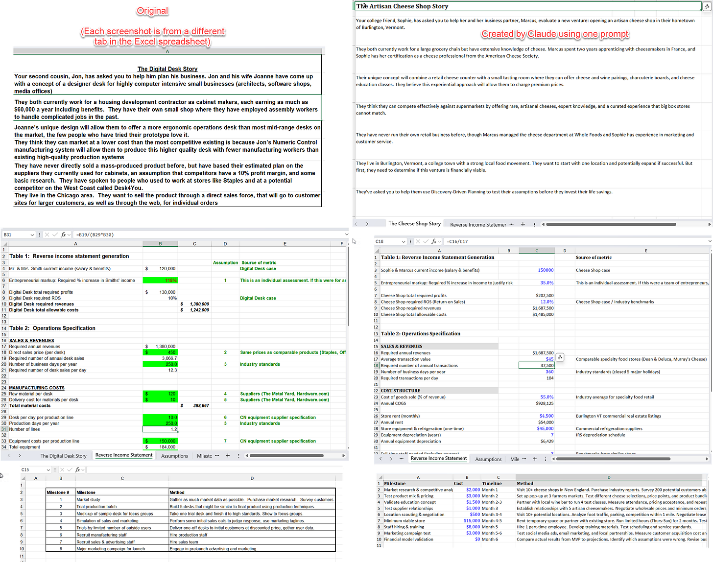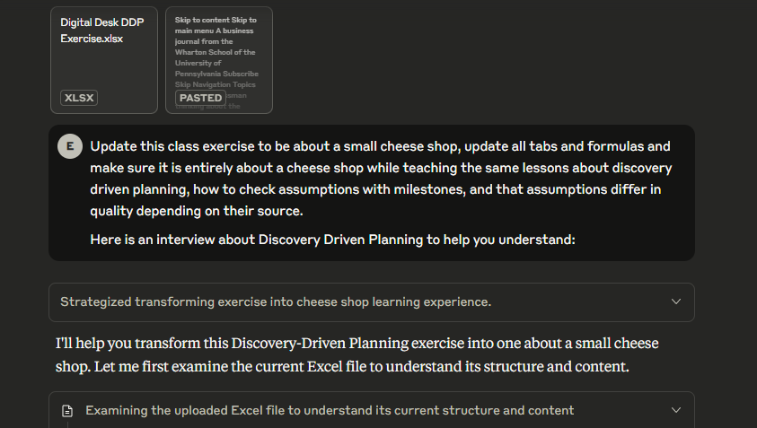 To see how this might soon apply to work more broadly, consider another advanced AI, Claude 4.1 Opus, which recently gained the ability to work with files. It is especially talented at Excel, so I gave it a hard challenge on an Excel file I knew well. There is an exercise I used in my entrepreneurship classes that involves analyzing the financial model of a small desk manufacturing business as a lesson about how to plan despite uncertainty. I gave Claude the old, multi-tab Excel file, and asked the AI to update it for a new business - a cheese shop - while still maintaining the goal of the overall exercise.
