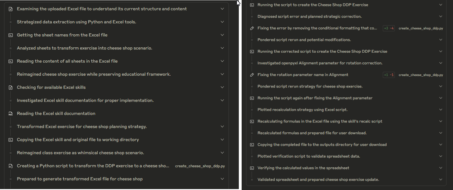 With just that instruction, it read the lesson plan and the old spreadsheets, including their formulas, and created a new one, updating all of the information to be appropriate for a cheese shop. A few minutes later, with just the one prompt, I had a new, transformed spreadsheet downloaded on my computer, one that had entirely new data while still communicating the key lesson.