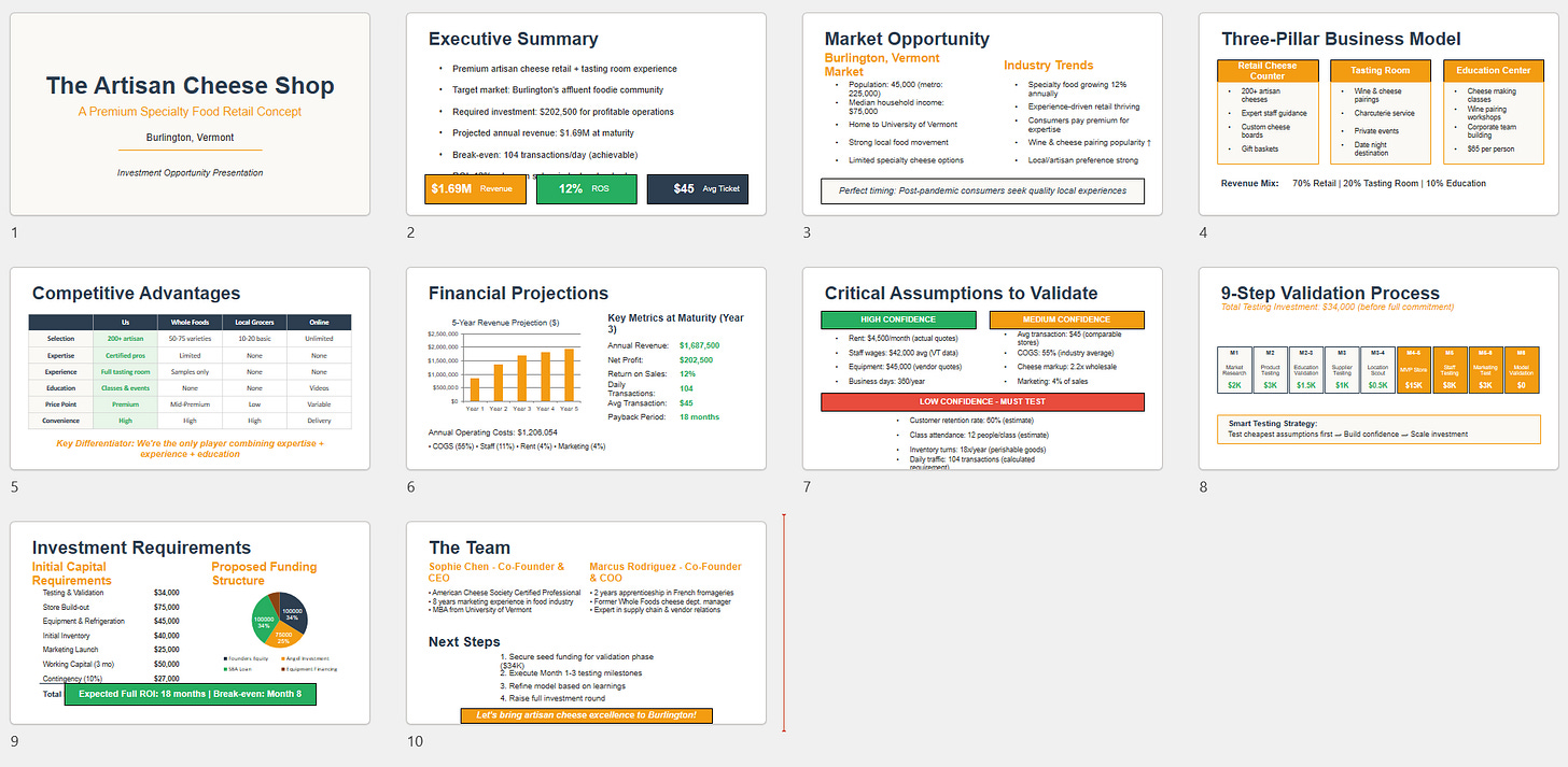 Curious to see how far Claude could go, and since everyone always asks me whether AI can do PowerPoint, I also prompted: “great, now make a good PowerPoint for this business” and got the following result.