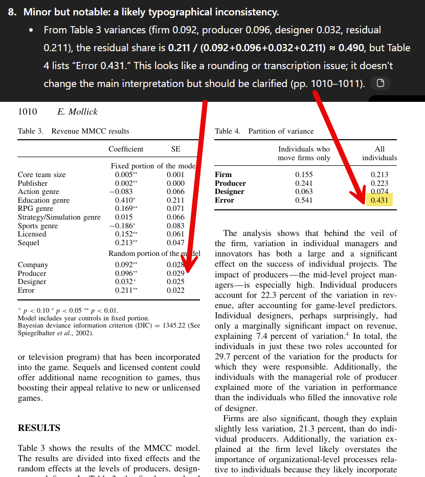 Nine minutes and forty seconds later, I had a very detailed critique. This wasn’t just editorial criticism, GPT-5 Pro apparently ran its own experiments using code to verify my results, including doing Monte Carlo analysis and re-interpreting the fixed effects in my statistical models. It had many suggestions as a result (though it fortunately concluded that “the headline claim [of my paper] survives scrutiny”), but one stood out. It found a small error, previously unnoticed. The error involved two different sets of numbers in two tables that were linked in ways I did not explicitly spell out in my paper. The AI found the minor error, no one ever had before.